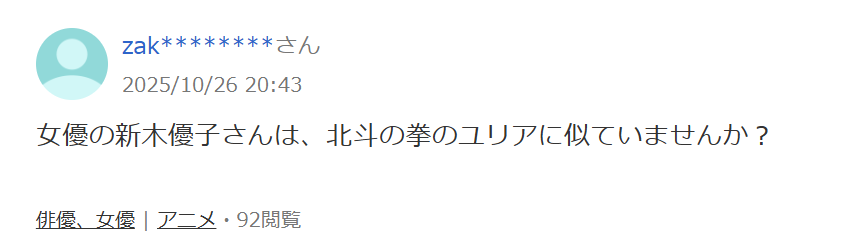 新木優子さんが、「北斗の拳」のユリヤに似ているという人がいます。