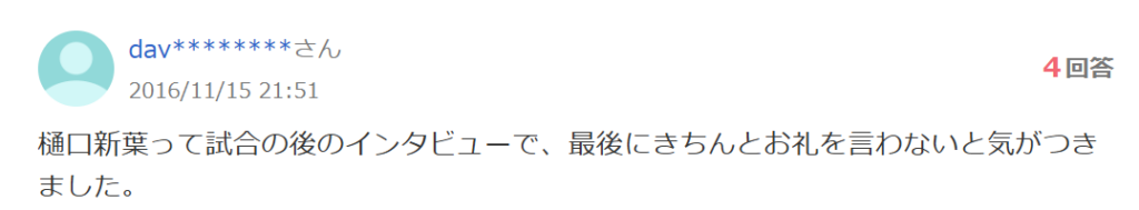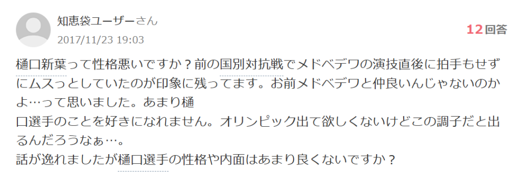 このように、ヤフー知恵袋では、樋口選手の性格に関する質問が、たびたびあります。
