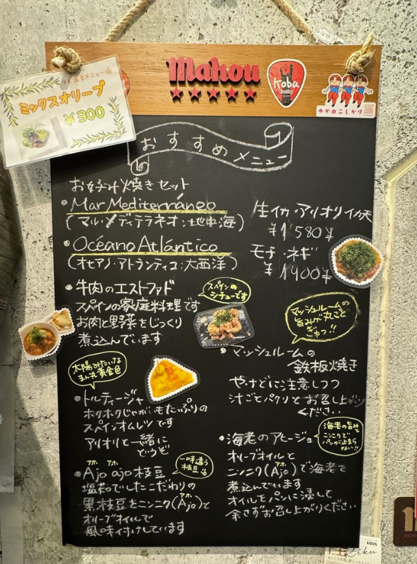スペイン料理では有名なタパスも提供。お好み焼きが焼けるのを待っている間は、