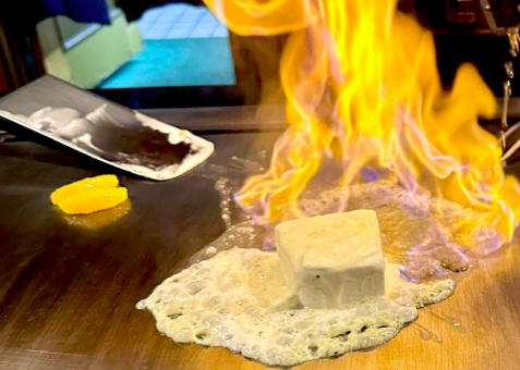 アイスブリュレは巷でも流行っていますが、番組では炎に包まれたアイスの鉄板焼きが登場します。