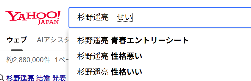 実は【杉野遥亮】とヤフージャパンで検索すると【性格が悪い】とサジェストが出てきます。(性格いいというサジェストも現れます)
