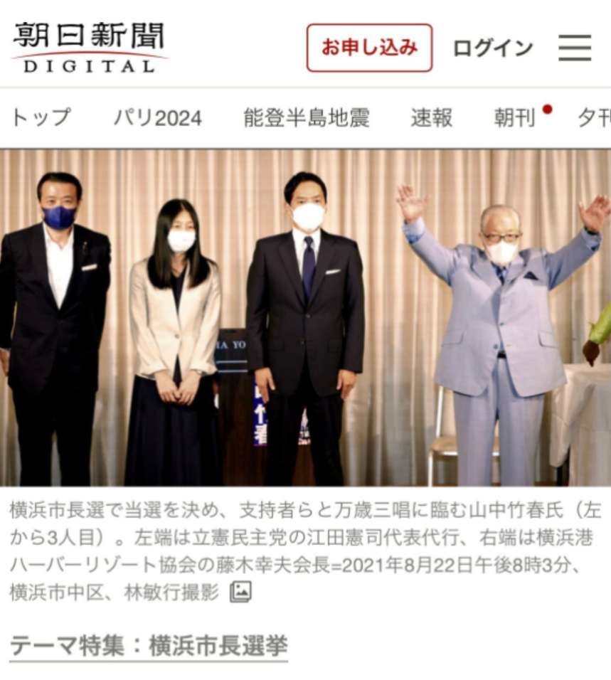 上の画像は、2021年8月22日の朝日新聞デジタルで紹介された、竹中氏の横浜市長当選の時のものです。